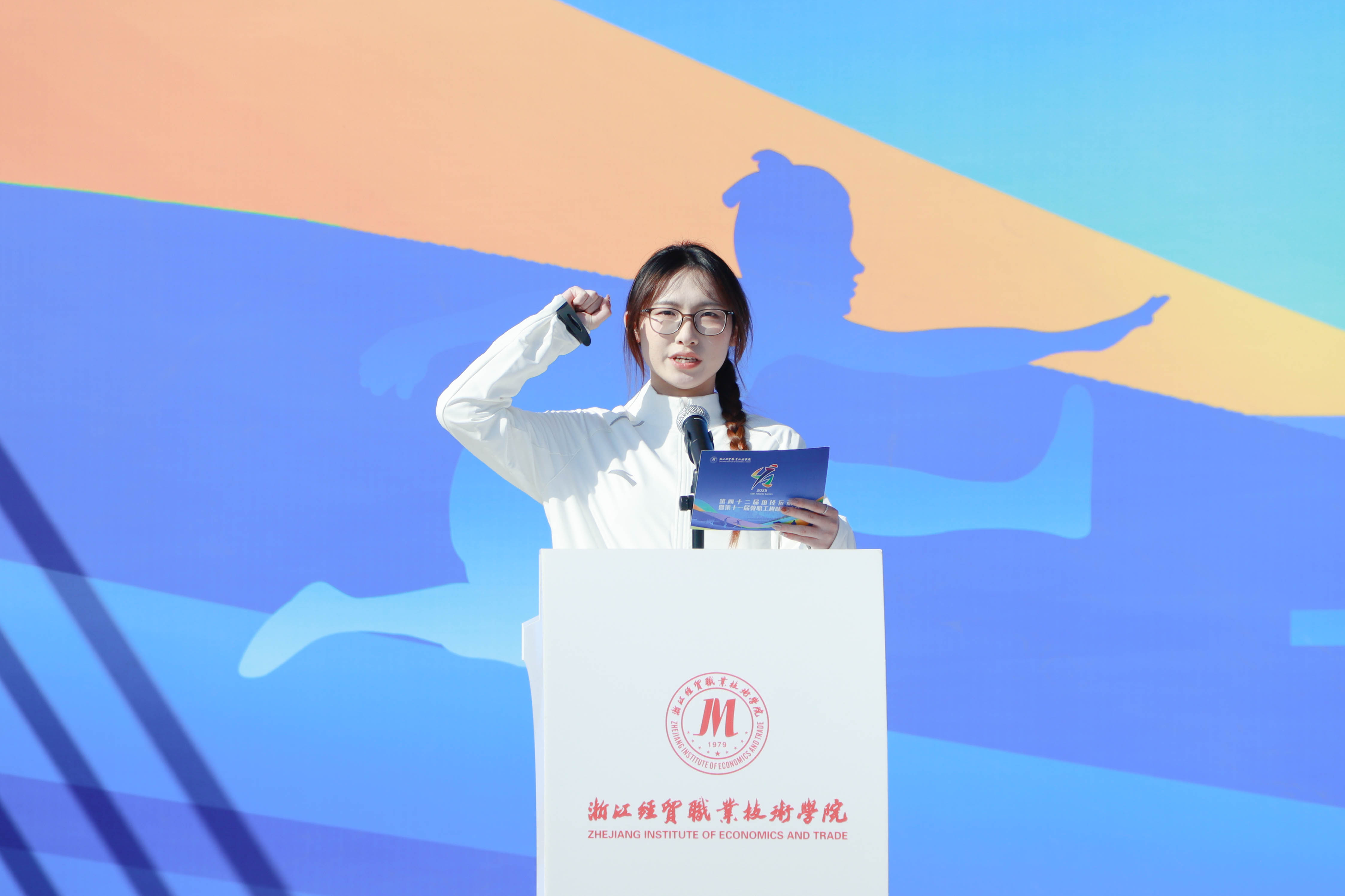Ye Huile, a student from Class 232 of International Trade in the School of Digital Trade, and Ren Liqiang, a teacher from the Physical Education Teaching and Research Office, took the oath on behalf of all athletes and referees, respectively.